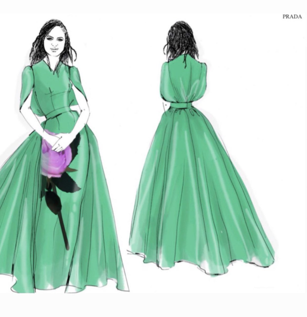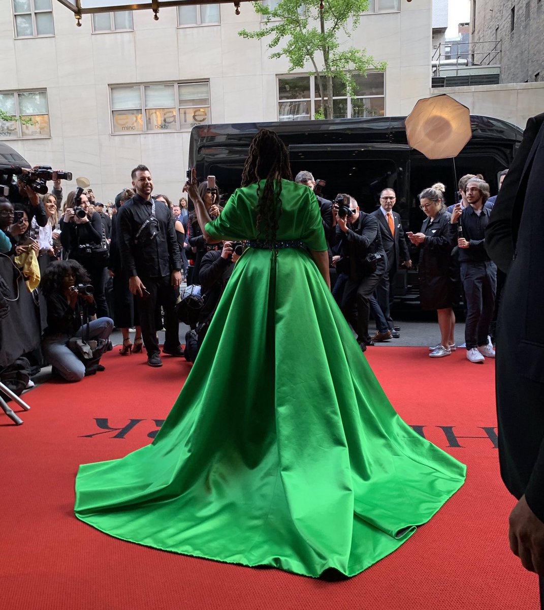 #MetGala2019 , Ava DuVernay wears a custom#Prada emerald green duchesse gown accented with a violet and pink oversized printed rose, and blue crystal belt, red satin bow shoes, and an emerald Swarovski studded crystal pouchette.#gorgeouspic.twitter.com/fdqEOK7i5n