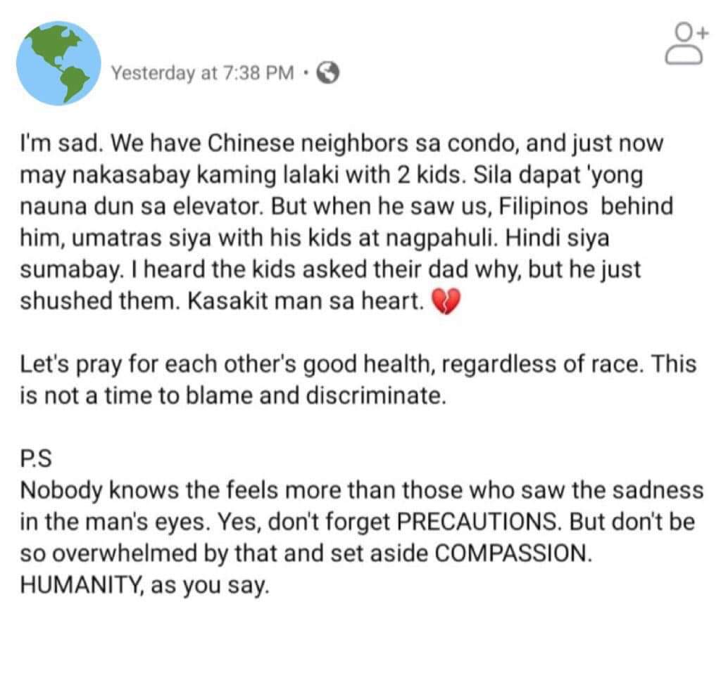Instead of blaming them, let’s pray for China especially those who risk their lives in helping those who are greatly affected by this crisis. Hate the virus, but don't hate the Chinese people. Remember they are still human and they're struggling too.