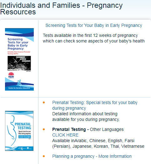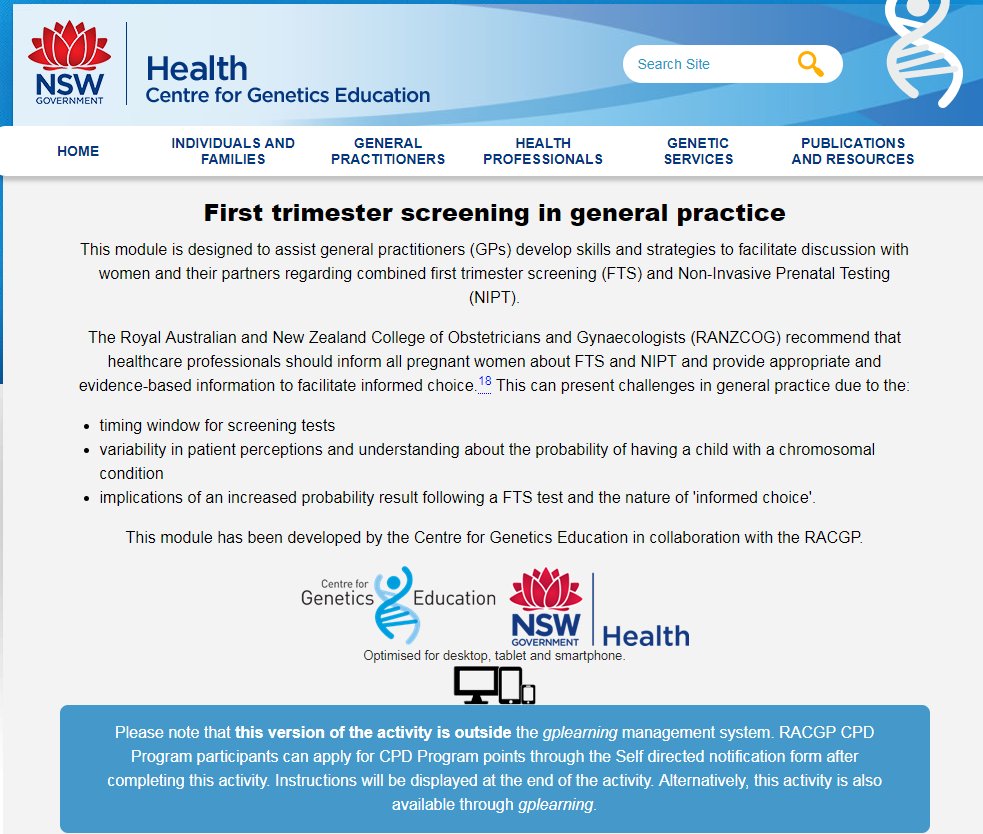 @RACGP, or our Centre for Genetics website: https://www.genetics.edu.au/health-professionals/online-learning/first-trimester-learning-module …. We've also got some great#prenatal screening/testing resources: https://www.genetics.edu.au/publications-and-resources/booklets-and-pamphlets/individuals-and-families-pregnancy-resources …pic.twitter.com/3EbY1MEJeg