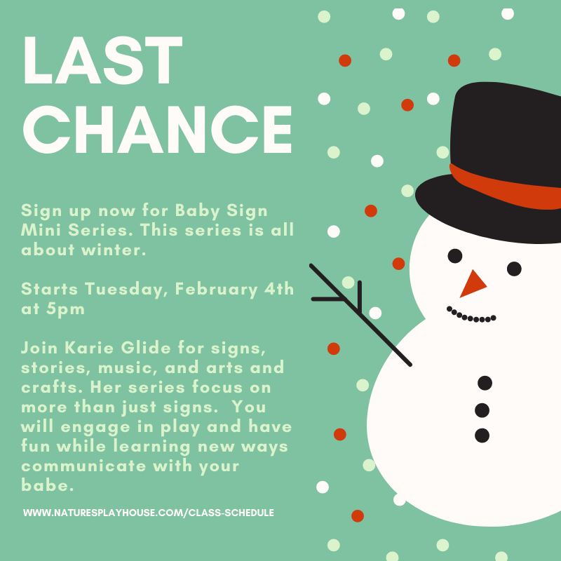Tuesday’s schedule! 10am Dropin Play 5pm Baby Sign Mini Series 6pm It Takes a Village 7:30pm Prenatal Yoga Last chance to sign up for baby sign!