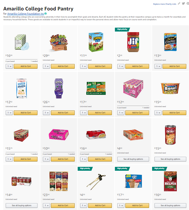 Did you know? You can donate to The Amarillo College Foundation by purchasing from our charity list, and the items on our list will go to the ARC's Food Pantry. It's a win-win! Access our Charity List here http://ow.ly/ZBuK50BOAuu Happy