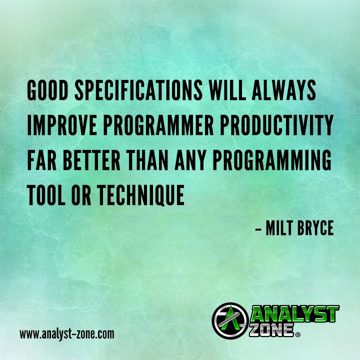 #Specification will always improve#Programmer#Productivity far better than any#Programming#Tool Or#Technique! - Milt Bryce http://www.analyst-zone.com#Texavi#AnalystZone on#agile#BusinessAnalysis#analysisforall#mobile#digital#newage#innovation#bigdata#ux pic.twitter.com/5jm6D106S3