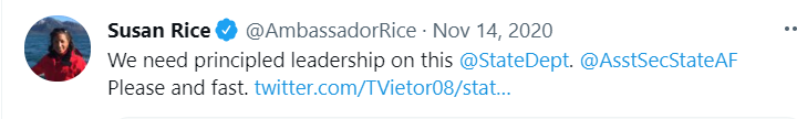 #TPLFTerroristGroup Campaign' was launched by the architect of evil- Susan Rice, on November 14, 2020, when it become clear that#TPLFTerrorists were being crushed by#ENDF. The well-coordinated tweets by Blinken & co came shortly after.#Project11779 pic.twitter.com/64IU6jNsQ3