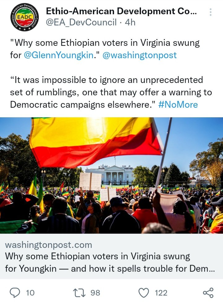 #Ethiopians#Eritreans &#Somalis in Virgiania, thank you for voting#NoMore Democrats & Congratulations for painting VA Red! They came for our Home and we will take their House. Georgia on my mind!#Project11779 https://twitter.com/GOP/status/1455702013799542788 … -