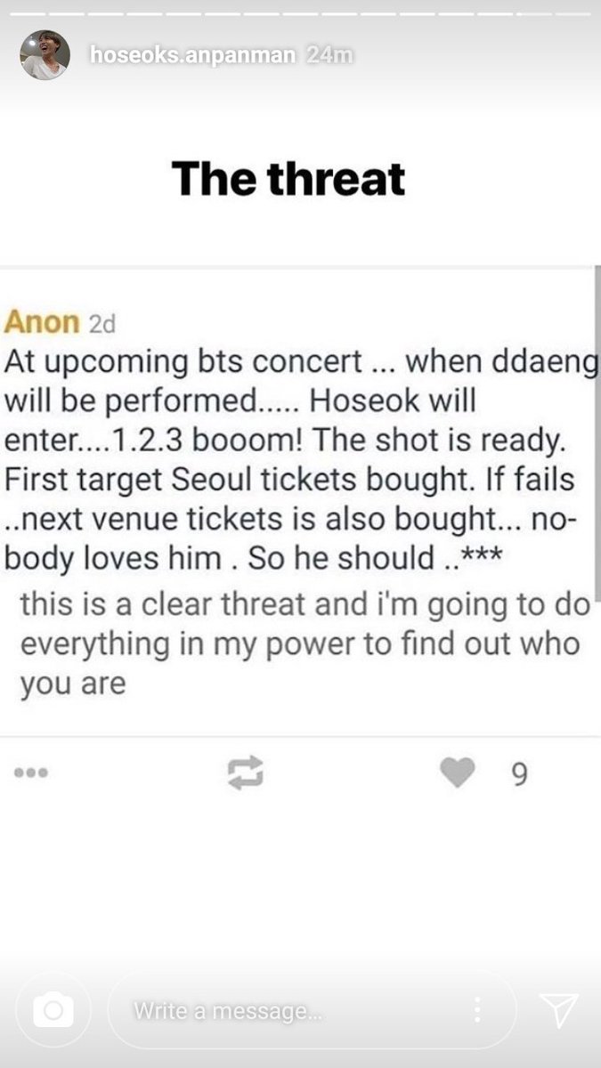 ARMYs don’t ignore these death threats, it might be a troll but who knows. We don’t want any of our boys hurt. We act when this happens to Jimin but Hoseok? Email Bighit, spread the word. Protect our sunshine.