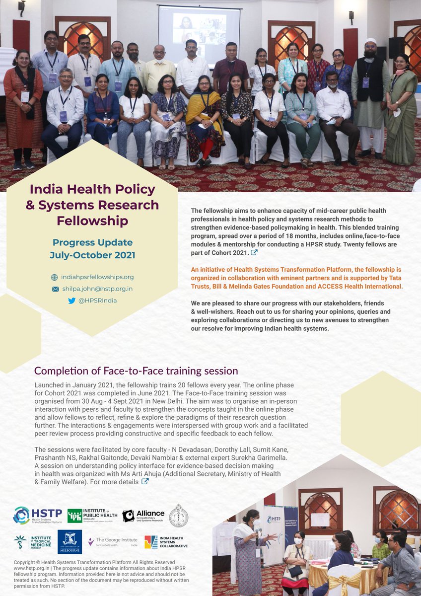 @HPSRIndia Progress Update July-October 2021#healthsystems#publichealth#research#healthpolicy#health#hpsrpic.twitter.com/WZCZCXiyrT