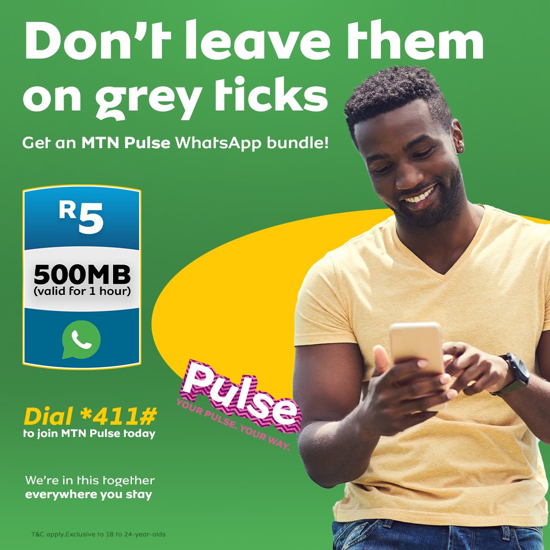 #MTNPulse WhatsApp bundle and get 500MB data, valid for 1 hour. Simply switch to MTN and dial *411# to join#Pulse and get this amazing bundle! We’re in this together,#EverywhereYouStay. Exclusive to 18 to 24-year-olds. T&C applypic.twitter.com/eVVcnZwgQS