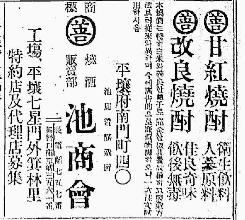 1922 June Sweet, red soju: hygienic beverage, ginseng ingredients Improved soju: exquisite flavour, innocuous after drinking. Factory located outside of Chilsong Gate,