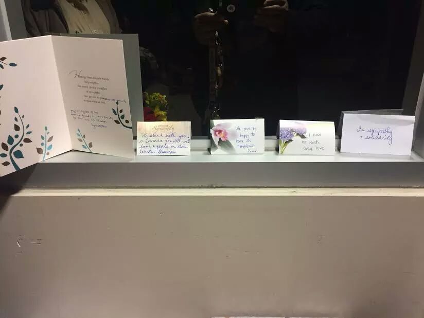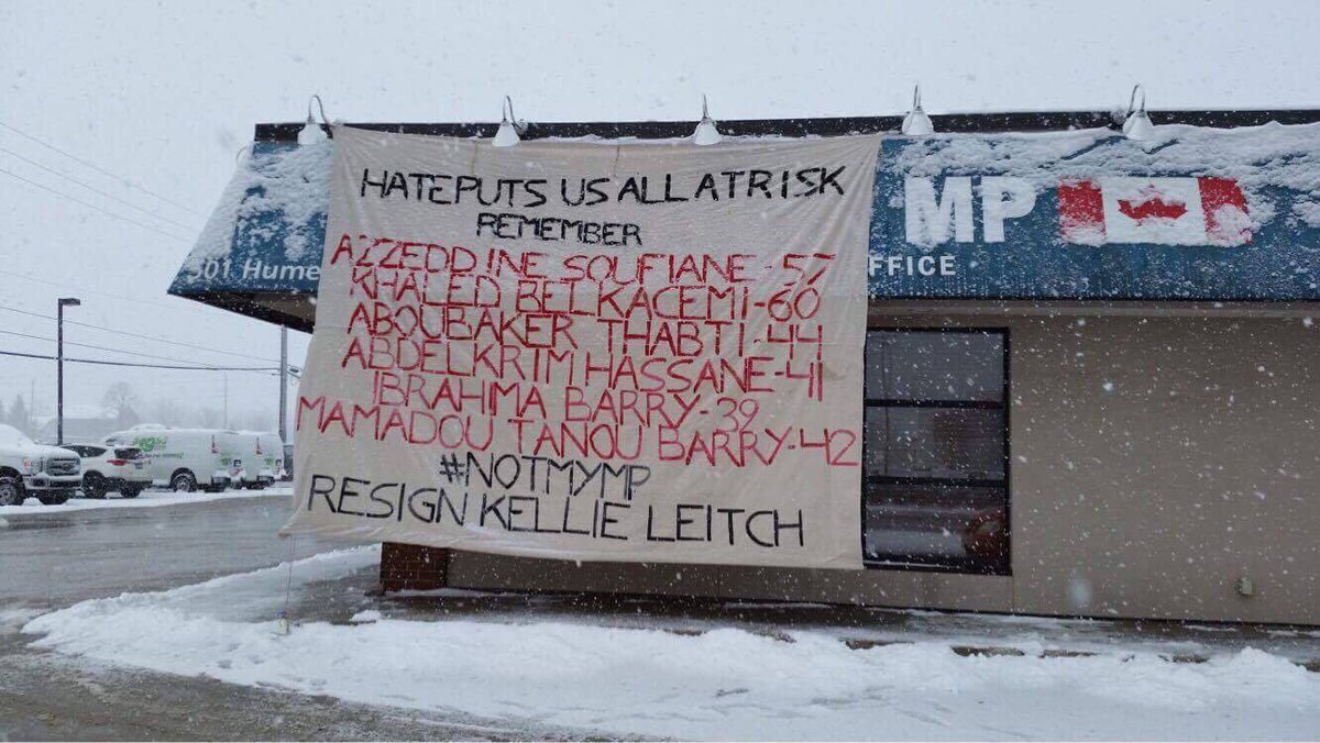#QuebecMosqueAttack victims of fascist terror hung from@KellieLeitch's riding office. Never again.#SmashRacism#canlab#cdnpolipic.twitter.com/7gbCdgISAa