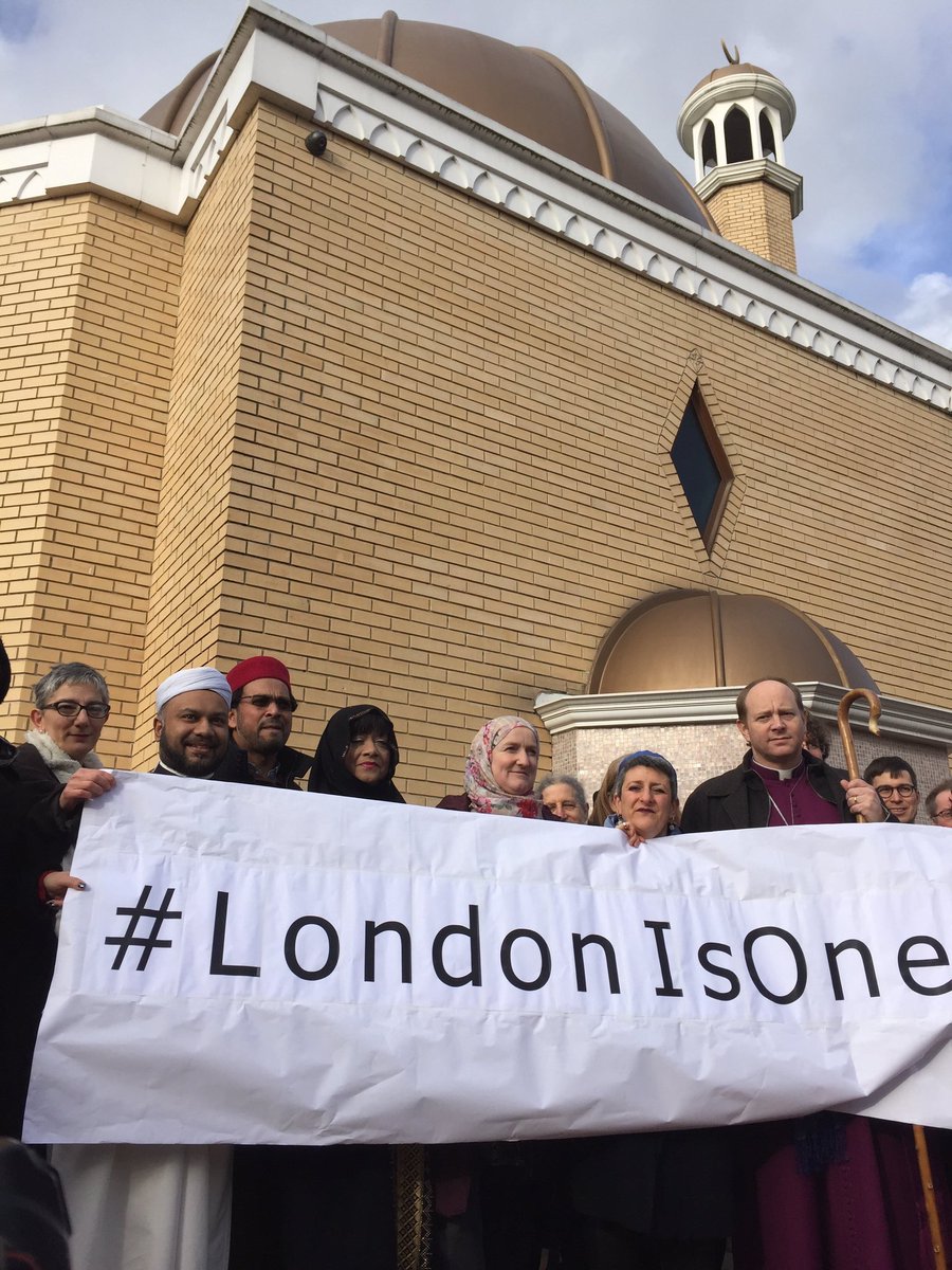 Londoners form a human circle around a Haringey mosque during Friday prayers in solidarity following