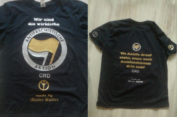 Das Symbol der Antifaschistischen Aktion kombiniert mit der Algiz-Rune (völkisch als 'Lebensrune' interpretiert) und dies in den Farben gold (s. Sonnenzeichen der Schrang-Shirts) und silber (vermutlich Referenz an 'Silberjunge', der zur