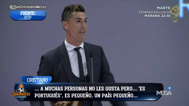 @CRISTIANO, MEJOR JUGADOR PORTUGUÉS de 2017 en las#QuinasDeOuro. LO VAS A VER a las 23:58h en#ElChiringuitoDeMegapic.twitter.com/aDeYO9OoFL