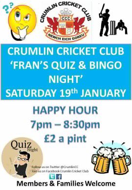 #quiz of the year@CrumlinCC will be on Saturday 19th January . All pints at £2 between 7-8.30pm . Come and join us for an awesome night .pic.twitter.com/PfGE0mzFTw