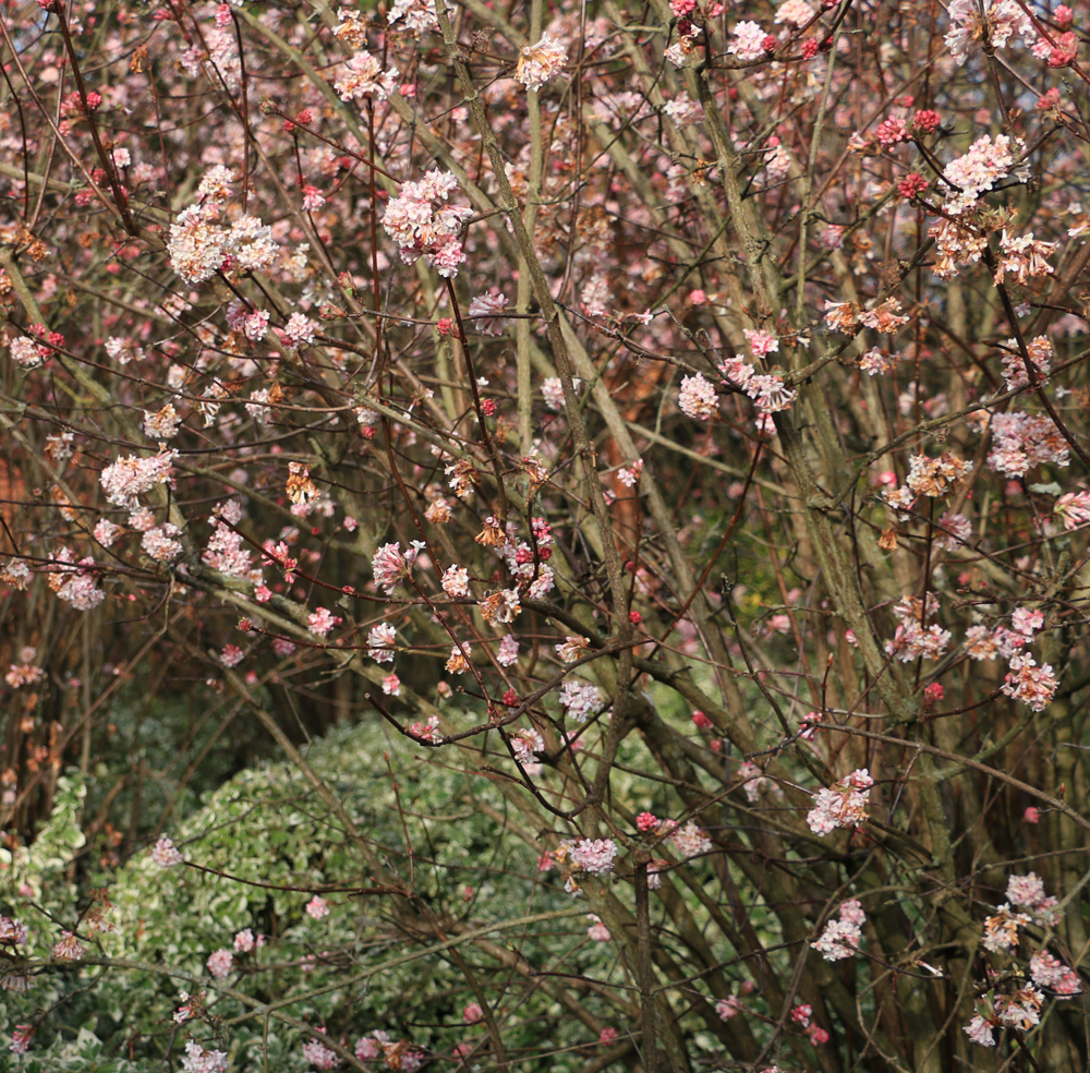 Viburnum bodnantense winter flowers on the bare stems and looks stunning now.