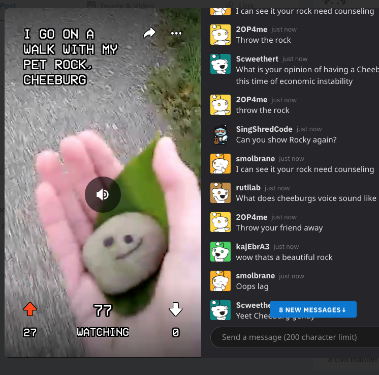 I've been watching a live stream of a 14-year-old boy walking his pet rock, Cheeburg, for the last 15 minutes. The kids are alright.