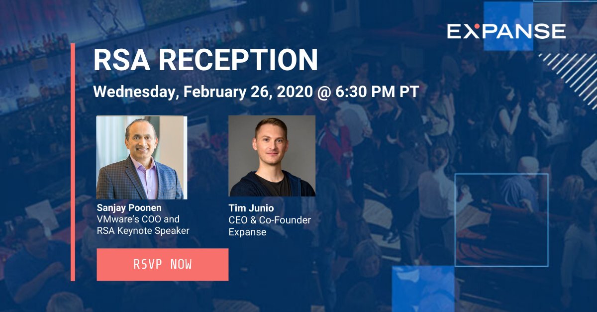 #RSA2020? Join@Expanseinc CEO Tim Junio for a reception with@VMware COO and#RSA2020 keynote speaker@spoonen for a discussion on the role of security in the future of enterprise IT. 2/26 at 111 Minna in SF! Register here: https://bit.ly/2RZcI30 pic.twitter.com/aYQRSRVNYO