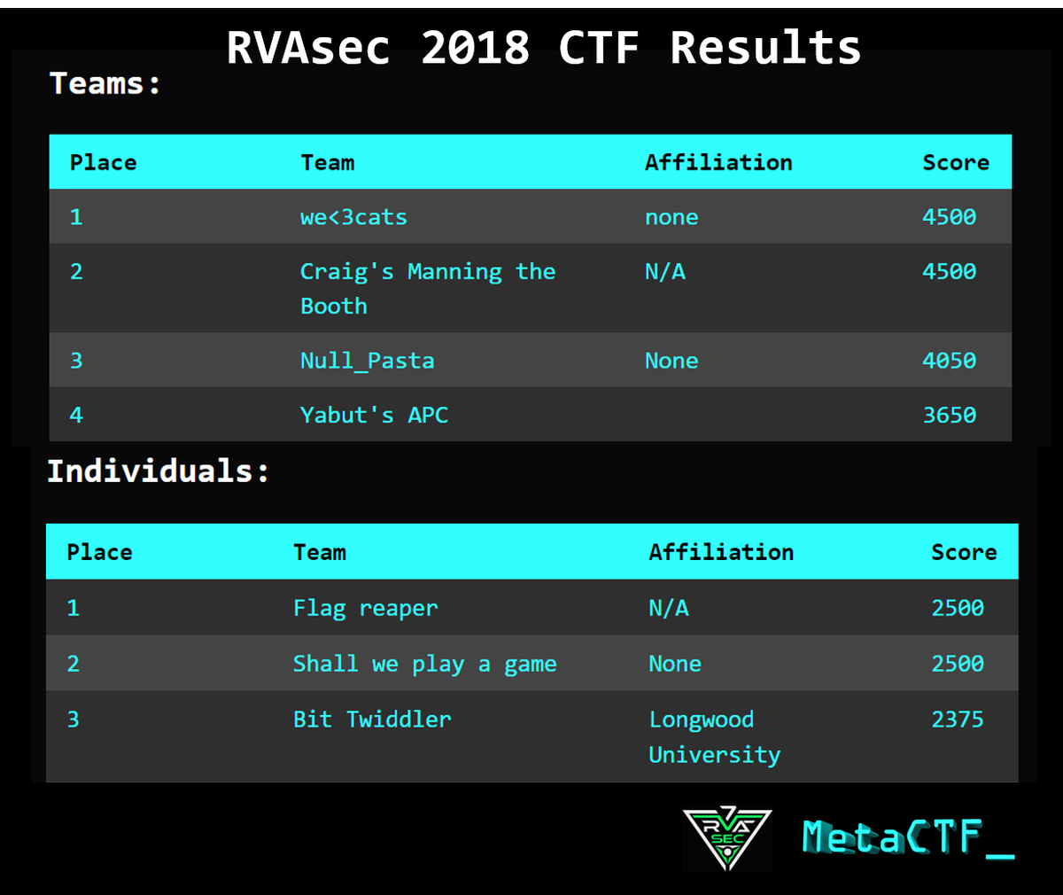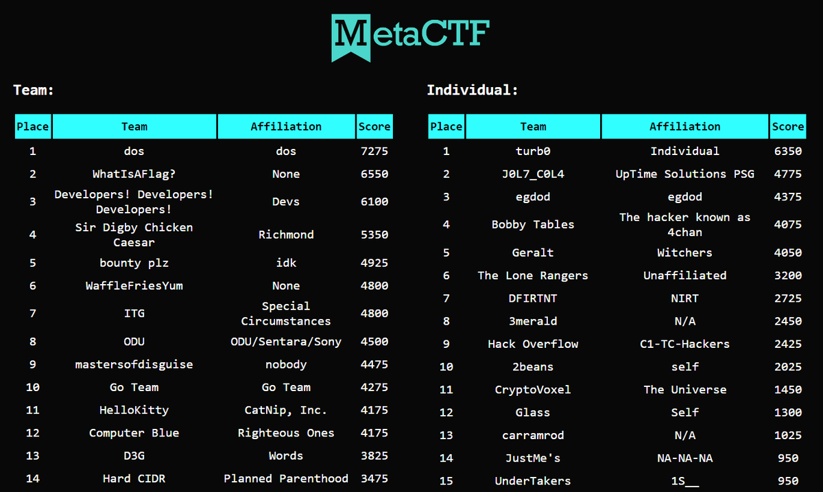 #MetaCTF@RVAsec in Richmond, VA. Thank you to@CapitalOne for sponsoring and all of the many volunteers. Congrats to all of the teams! The final scoreboard is now visible on the MetaCTF site within the#RVAsec event as well. pic.twitter.com/b4ZYs1B88u