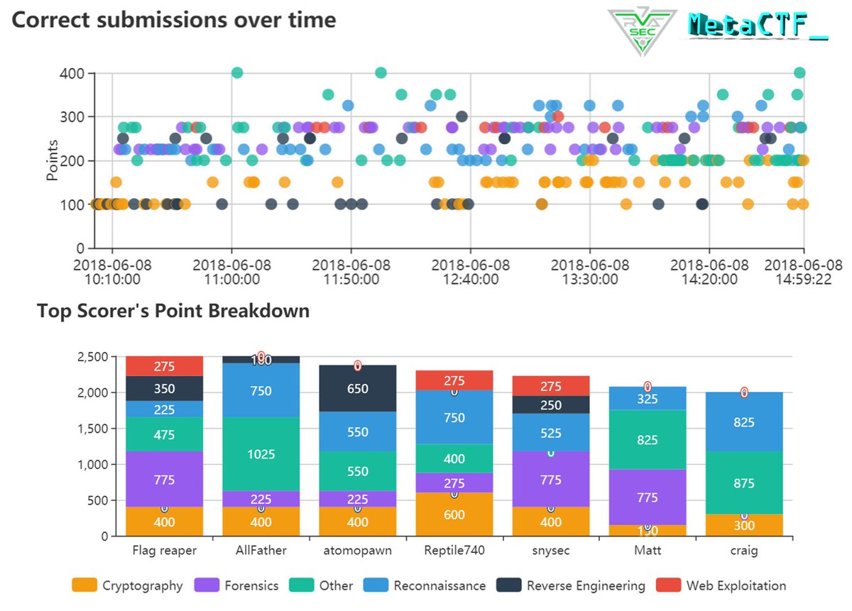 @RVAsec#CTF yesterday! This was the largest#RVAsec CTF by far with nearly 50 problems, 1000 submission attempts, and 85 competitors. Congrats to we<3cats and Flag reaper for taking 1st place! Thanks to@Crowdstrike for sponsoring!pic.twitter.com/8CQDvekXja