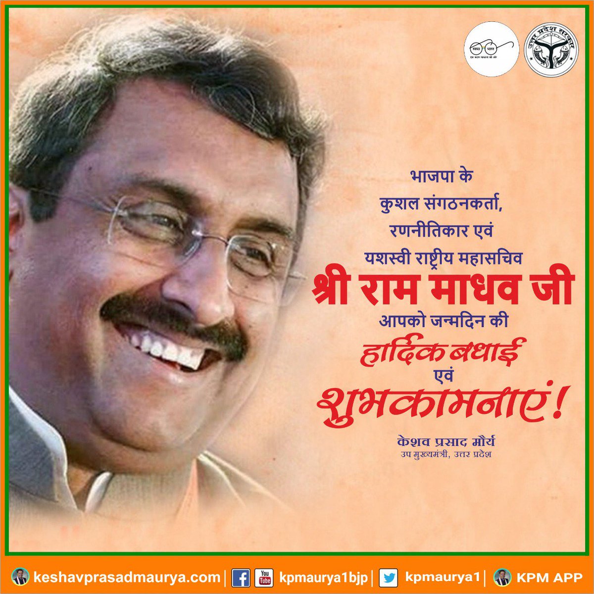 भाजपा के कुशल संगठनकर्ता, रणनीतिकार एवं यशस्वी राष्ट्रीय महासचिव श्री राम माधव जी, आपको जन्मदिन की हार्दिक बधाई एवं शुभकामनाएं! ईश्वर से प्रार्थना है कि आप दीर्घायु हों और सदैव स्वस्थ एवं प्रसन्न रहें!