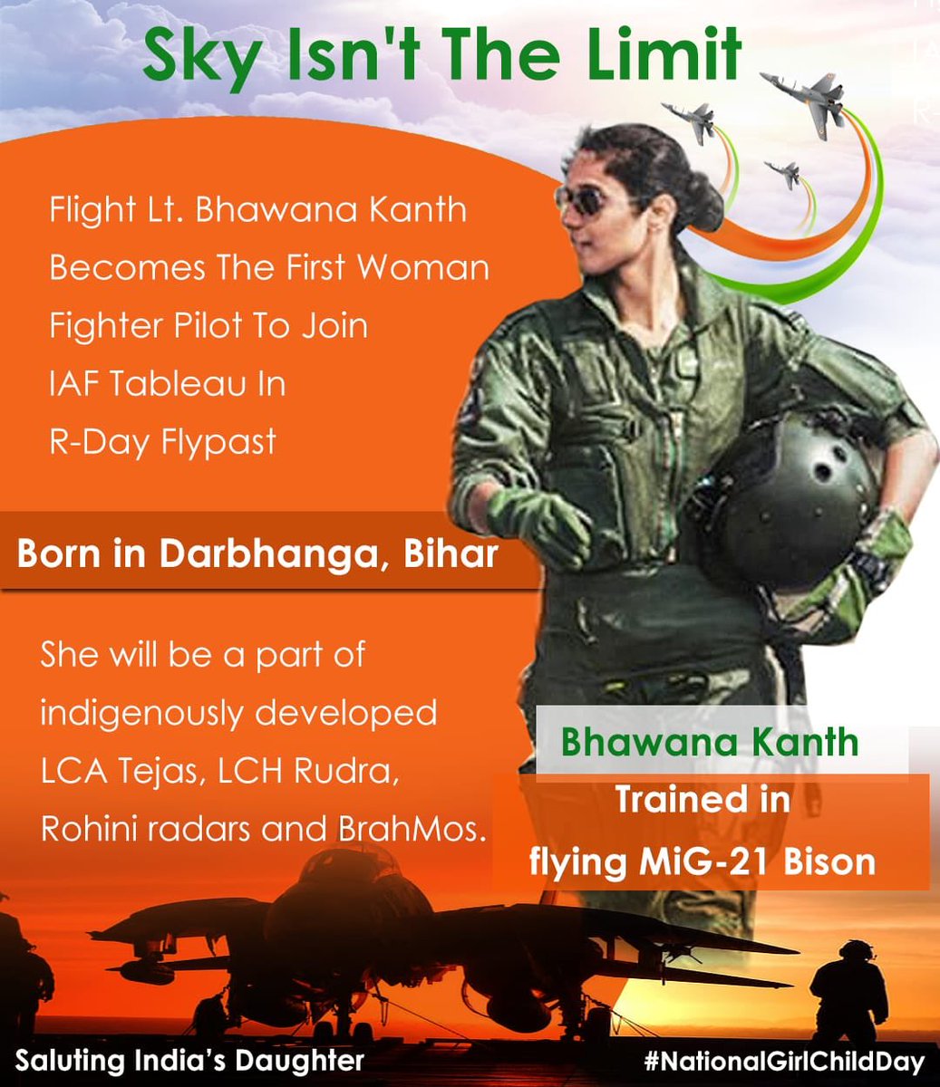 #RDay Parade as Darbhanga-born India's daughter Flight Lieutenant#BhawanaKanth becomes the first female fighter pilot to join the ceremonious, valorous and heroic#IAFflypast#BetiBachaoBetiPadhao Indeed, she is#a_cut_above!pic.twitter.com/MEX5wYMx25