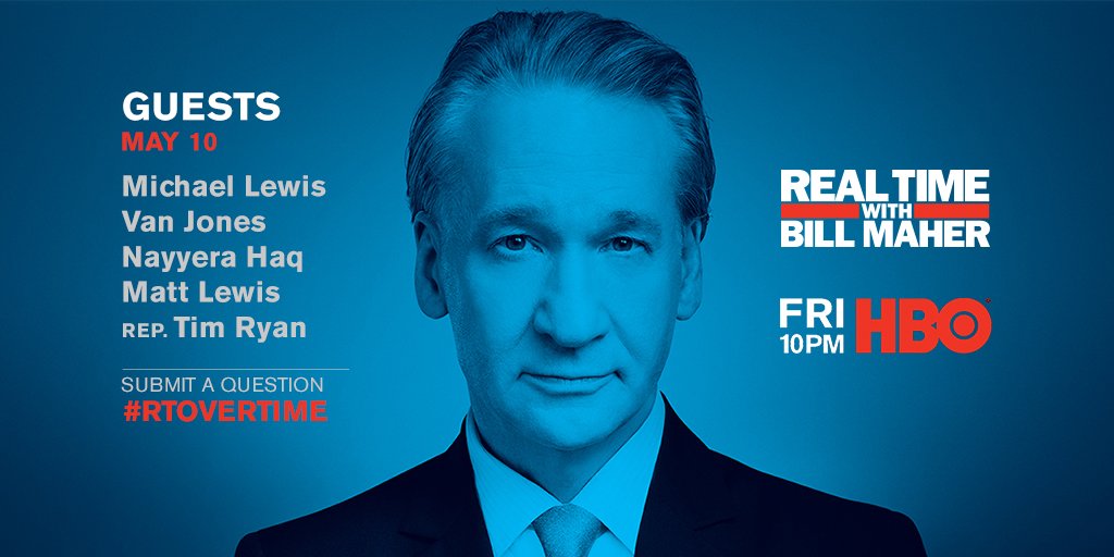 @BillMaher will be LIVE with#AgainstTheRulesPod host#MichaelLewis, Ohio Rep.@TimRyan,@VanJones68,@nayyeroar &@mattklewis on#RealTime@HBO! http://bit.ly/May10Guests pic.twitter.com/so9CNUy9o7