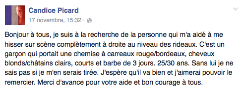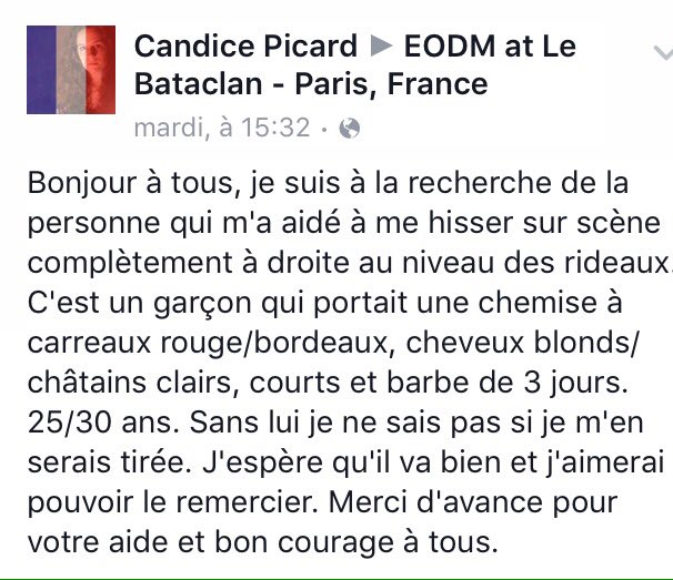 #rechercheBataclan Une amie au pull vert cherche les personnes blessées qu'elle a accueilli dans sa cour pour des news@RECHERCHEPARIIS -