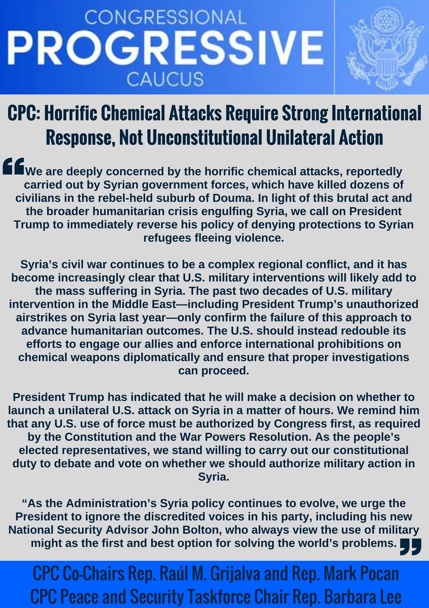 #Syria -- he must come to Congress first. We call on President Trump to lift his#RefugeeBan to save innocent Syrians and to use diplomacy rather than force. Read our full statement: https://bit.ly/2EDWmV2 pic.twitter.com/qifIlRG2OI