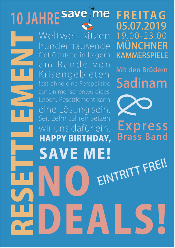 #Resettlement , NO DEALS! Wir feiern 10 Jahre@SaveMeMuenchen am 05.07. in den@M_Kammerspiele. Mit den Brüdern Sadinam & der Express Brass Band!