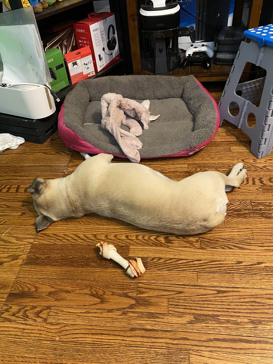 Zelda decided to give her favorite toy the bed, and she’s sleeping on the hard floor. That’s true love