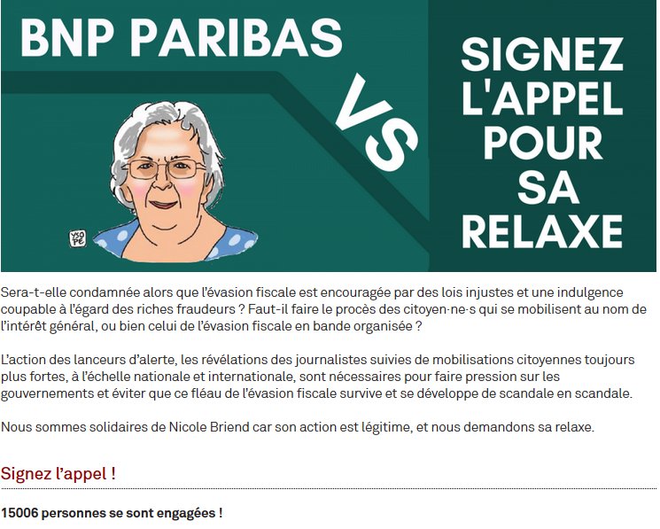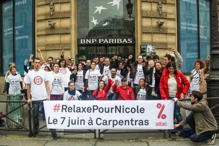 Nicole Briend passe aujourd'hui devant le Tribunal de Carpentras pour avoir dénoncé symboliquement l'activité de la BNP Paribas dans les paradis fiscaux. Plutôt que de la condamner, remercions Nicole d'être une citoyenne responsable et active !