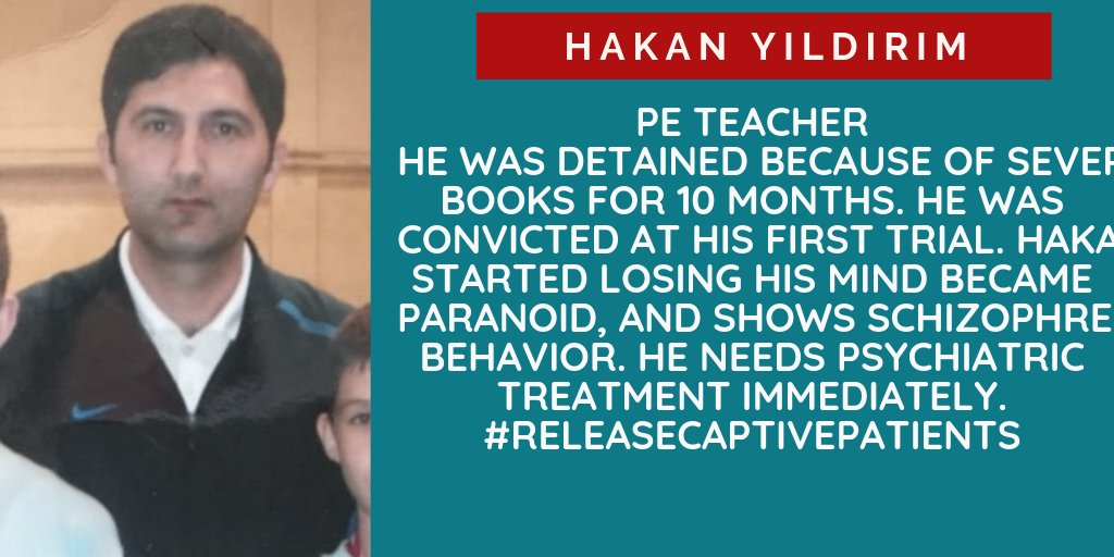 Hakan YıldırımPE teacher He was detained because of several books for 10 months.He was convicted at his first trial.Hakan started losing his mind became paranoid,and shows schizophrenic behavior.He needs psychiatric treatment immedi