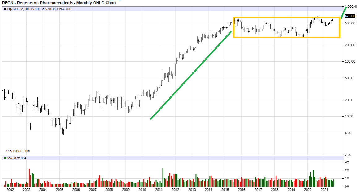 Regeneron (REGN). Short term consolidation after breakout of large consolidation pattern. This is a new, fresh bull market.