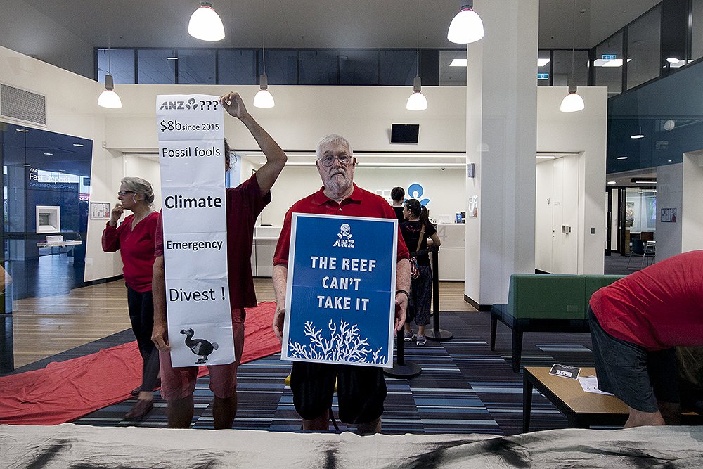 @StopAdaniCairns people occupy the ANZ bank, blockading for more than an hour. People will stand up and draw a#RedLine Enough is enough@Jackthelad1947@ANZ_au is the largest bank investor in Fossil Fuels with the lowest proportion of#Renewables investment.@FoEAustraliapic.twitter.com/ZSzRtapbau