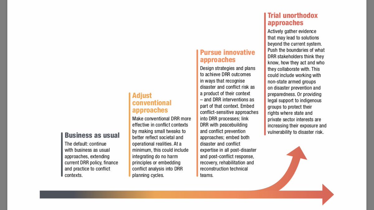 Where governments & agencies position themselves on this ‘continuum of options for action’ depends on how bold they want to be to face the reality that climate & disaster risk is inherently political, as are the solutions. https://www.odi.org/publications/11408-disaster-risk-reduction-conflict-contexts-agenda-action …