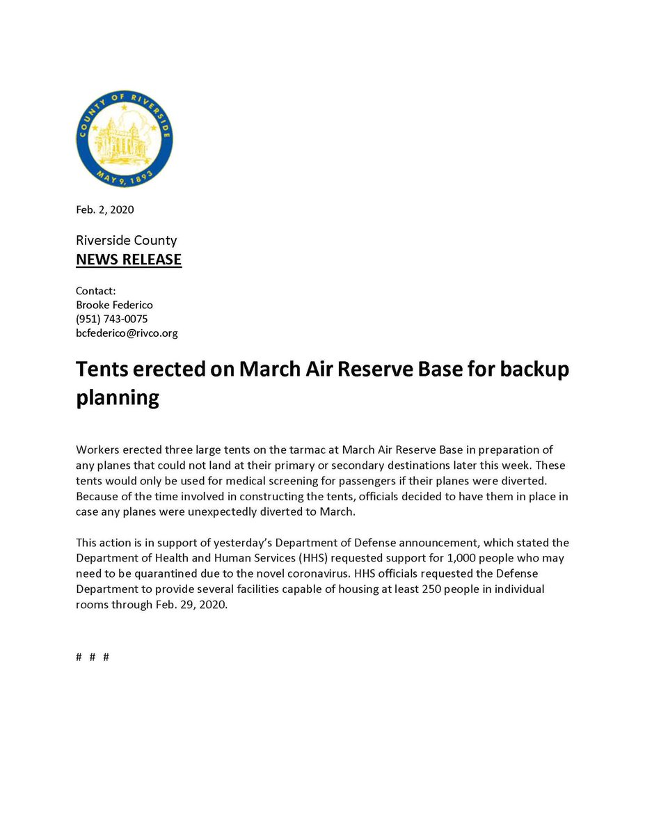 @CDCgov and will continue to work with local, state and federal reps to protect the health of the returned passengers, residents of March Air Reserve Base and all RivCo community members.#rivconow https://twitter.com/CDCgov/status/1223312319205249024 … -