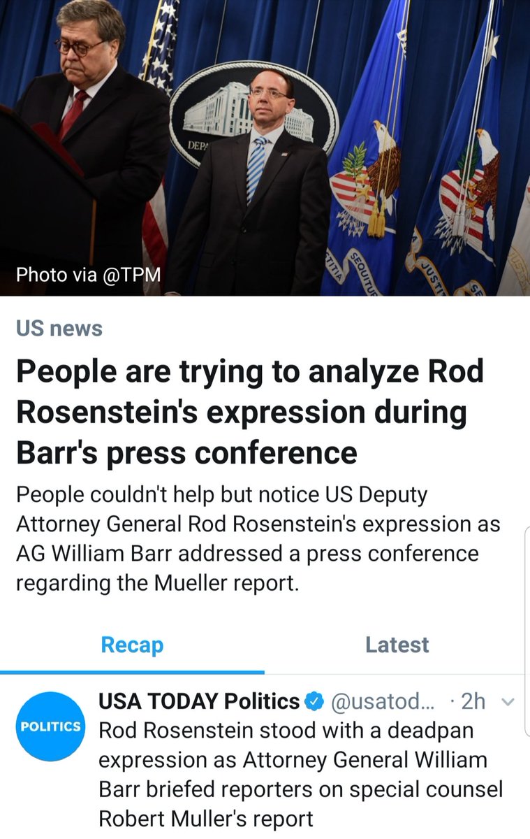 #RodRosenstein looked like the guy who was told you will stand there and shut up..or you can kiss your pension good bye And Twitter took note https://www.usatoday.com/story/news/politics/2019/04/18/mueller-report-rod-rosensteins-deadpan-behind-barr-draw-twitter-jabs/3506624002/ … via@usatoday -