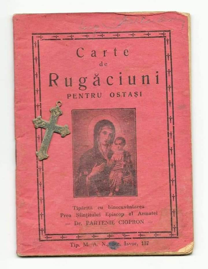 "Prayer Book for Soldiers printed with the blessing of His Holiness Bishop of the Army Dr. Partenie Ciopron." Chaplains handed out such prayer books and little crosses to soldiers on the front in addition to giving sermons and lectures.