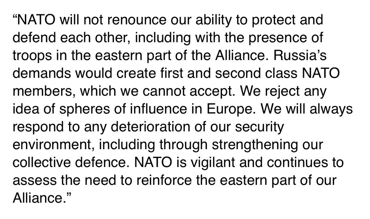 #Russia’s demands wld create 1st & 2nd class#NATO members, which we cannot accept. We reject any idea of spheres of influence in Europe. And we will not renounce our ability to protect & defend each other. My response to@mfa_russia claims re@NATO Allies#Bulgaria#Romania