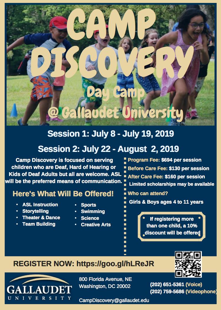 Gallaudet will offer two sessions of Camp Discovery this summer. The ASL day camp is for kids ages 4–11 years & features a range of fun activities.