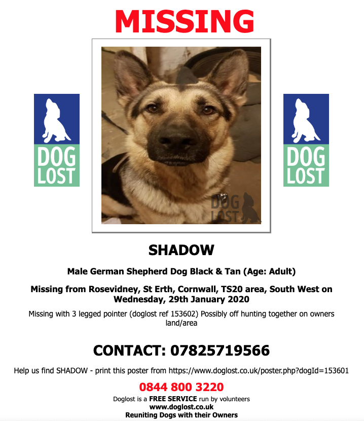 #LOST#DOG SHADOW Male#GermanShepherd#Missing with HERO from#Rosevidney#StErth#Cornwall#TS20 Wednesday, 29th January 2020#LostDog#ScanMe https://doglost.co.uk/dog-blog.php?dogId=153601 …@VetsGetScanning@SAMPAuk_@SarahP2311pic.twitter.com/lxpXl3lFO1