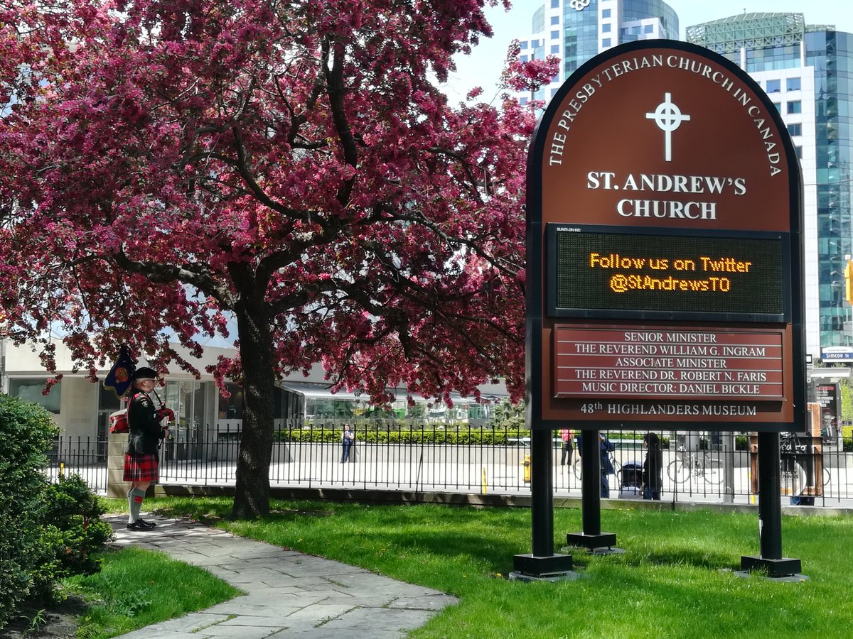 Klaar voor programma in Toronto. De doedelzakspeler is aan het oefenen