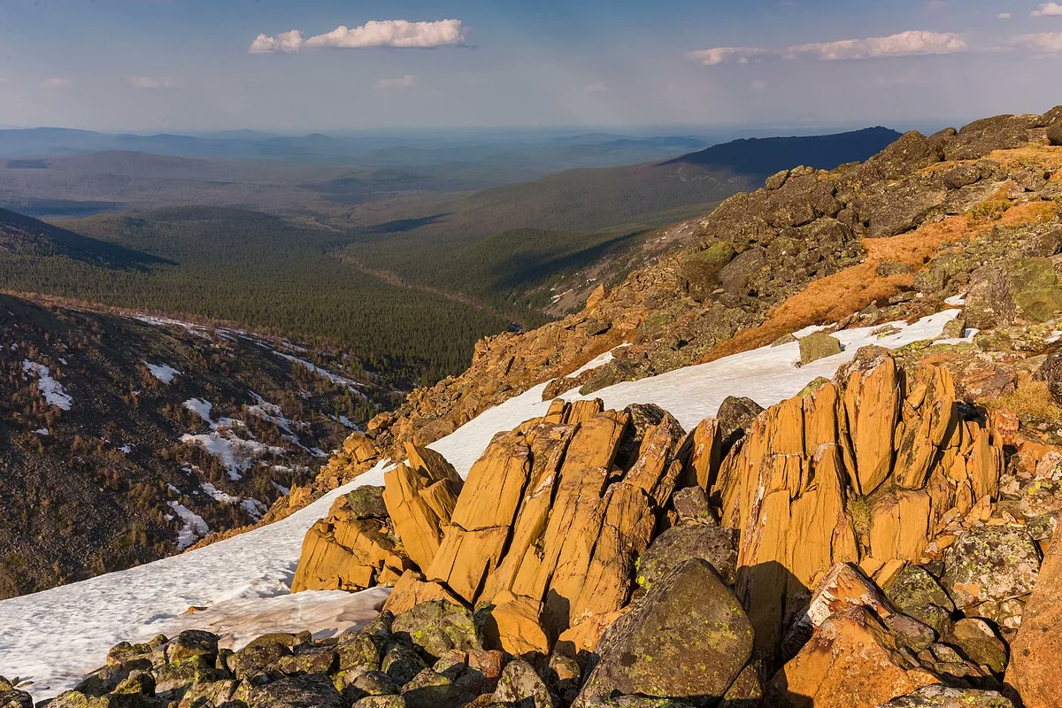 Ural Mountains. The highest peak - Narodnaya 1895m It extends from North to South through the Western part of Russia, from the Arctic ocean coast to the Ural river and Kazakhstan. The mountain range is part of the border between the continents of Europe and Asia