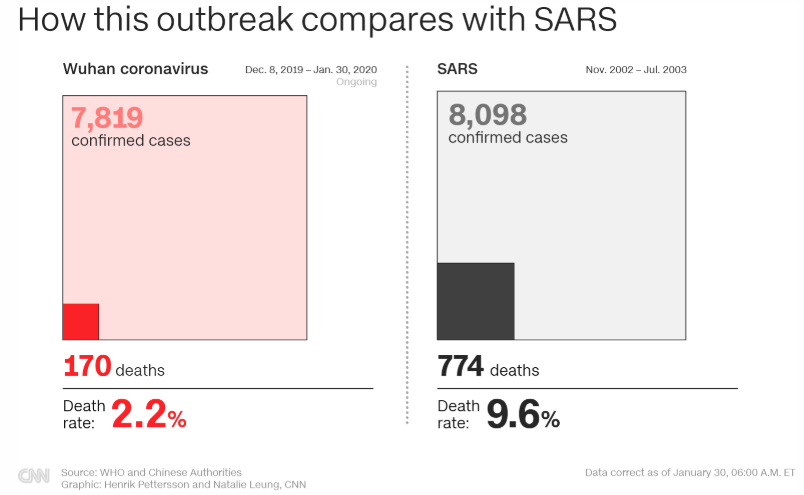 #WuhanOutbreak.#2019nCoV less fatal than SARS: 2.2% vs 9.6%. SARS was contained within months.#China has experience from the 2003#SARSvirus. 700 people die of#Tuberculosis each day in China 34,000 flu deaths in US last year.pic.twitter.com/m04YPqi6mG