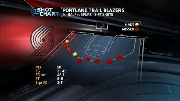 The Blazers lead by 2 at halftime despite shooting just 2-of-11 from 3-point range in the first half.