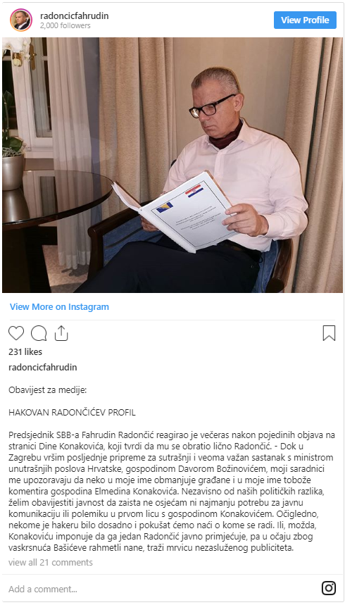 O bože kako smo sigurni, hakovan profil Fahrudina Radončića. Tako ću ja kad mi dođe opomena iz EP da nisam platio račun ja ću reći da je hakiran.