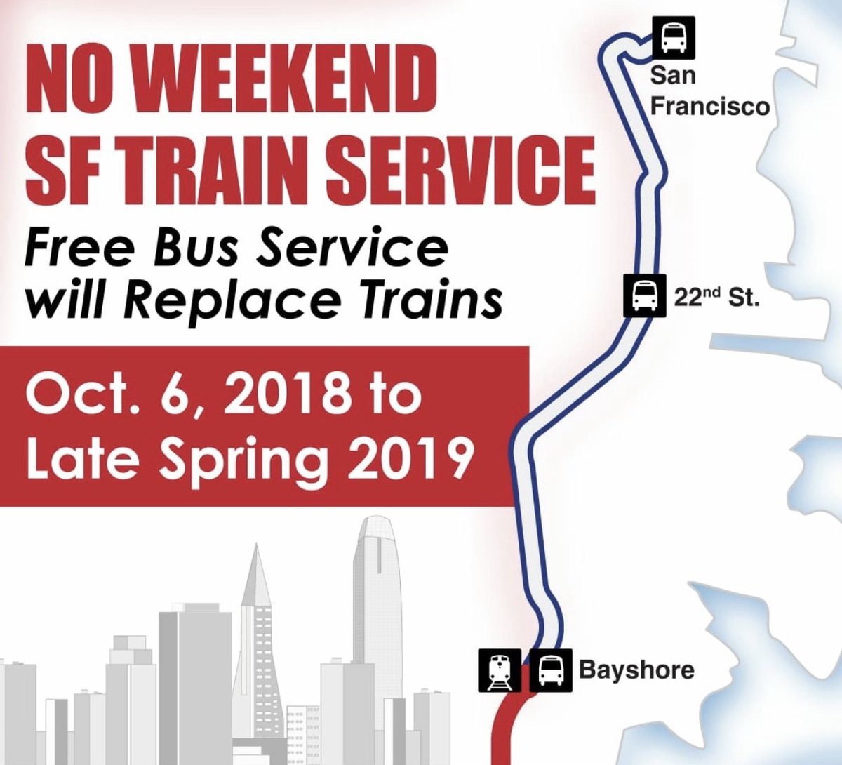 Free @SamTrans bus service will be provided from Bayshore.#Caltrain#CalMod Full Info: http://www.caltrain.com/riderinfo/newsletterandnotices/Weekend_SF_Caltrain_Closure_Oct__6__2018___Late_Spring_2019.html …pic.twitter.com/D2kwfAF1zS