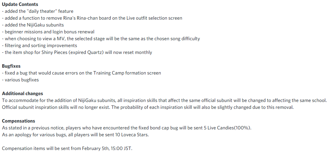 #SIFAS] Version 1.4.0 has been released. The game will be in maintenance from 13:00 JST to 15:00 JST on February 4th to apply some of the changes. Update will be mandatory after the maintenance. pic.twitter.com/mkYsB0ON1d