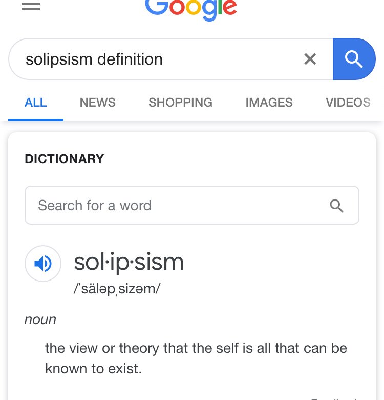 #Solipsism is the philosophical idea that only one's mind is sure to exist. As an epistemological position, solipsism holds that knowledge of anything outside one's own mind is unsure.#addtodictionaryhttps://images.app.goo.gl/dp9nA5g4EQDHkLap8 … -