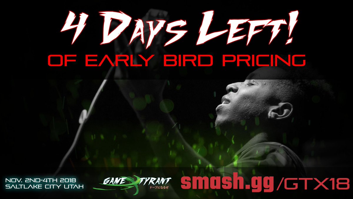 There are just 4 DAYS left of Early Bird Pricing for GT-X 2018! Venue fee will increase from $55 -> $65 Get your tickets NOW! http://smash.gg/gtx