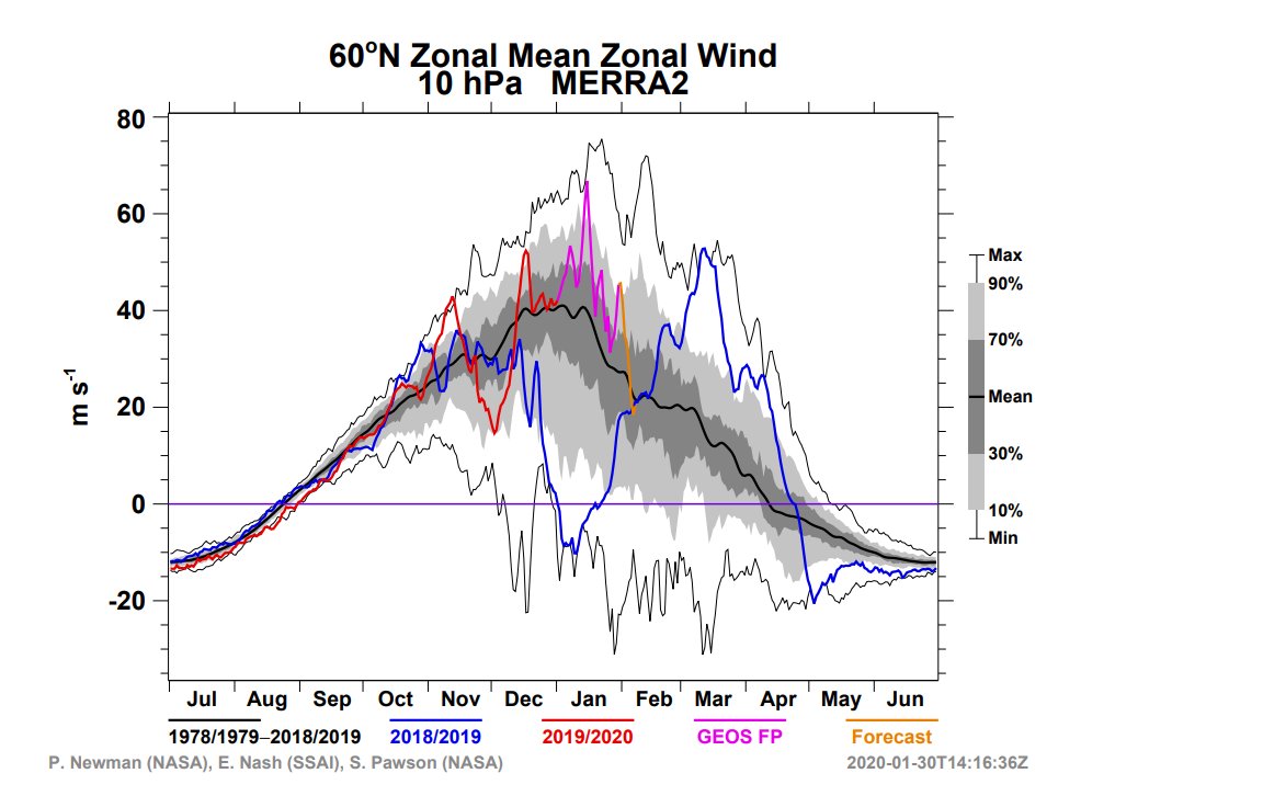 #SSW with 10hPa/60N reversal in zonal winds has diminished. Some#PV weakening is expected in the medium-term but not majorly so. https://twitter.com/Official_WXUK/status/1220661769137459200 …pic.twitter.com/WNVc4kNO5e